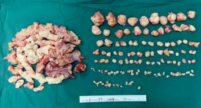經手術后稱重肌瘤組織約2.02Kg,粗略估計子宮肌瘤共109個。